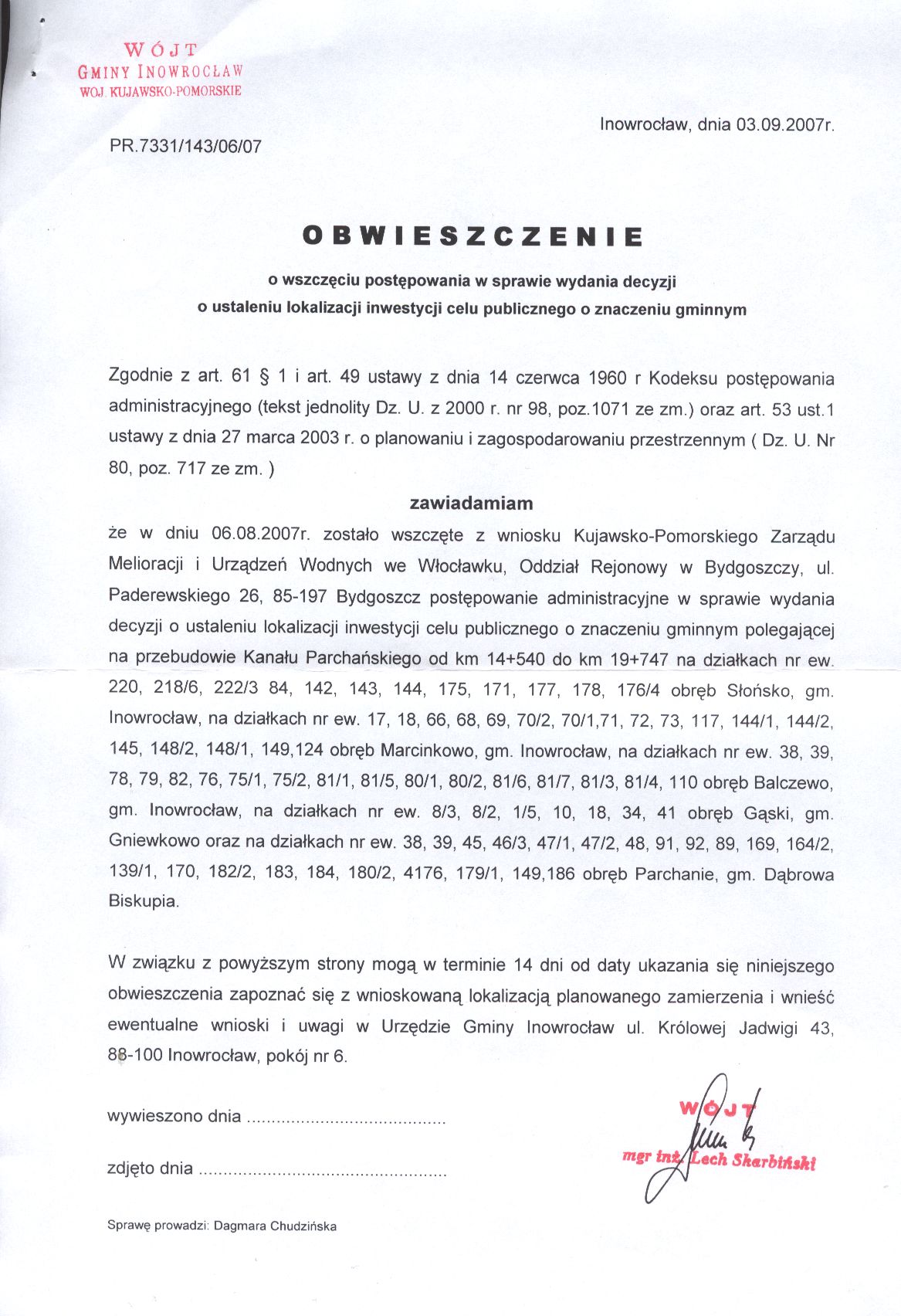 Obwieszczenie o wszczęciu postępowania w sprawie wydania decyzji o ustaleniu lokalizacji inwestycji celu publicznego o znaczeniu gminnym na przebudowie Kanału Parchańskiego.
