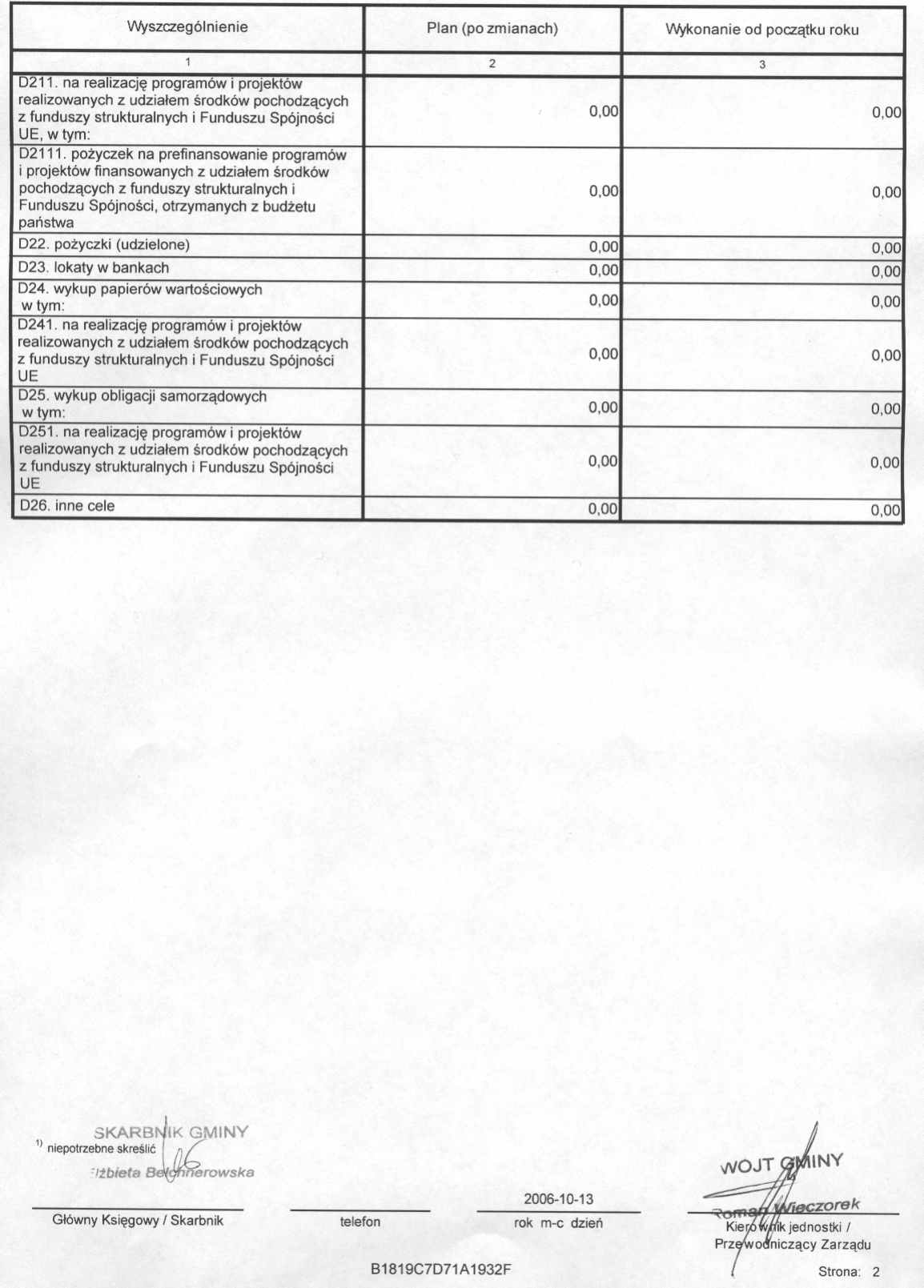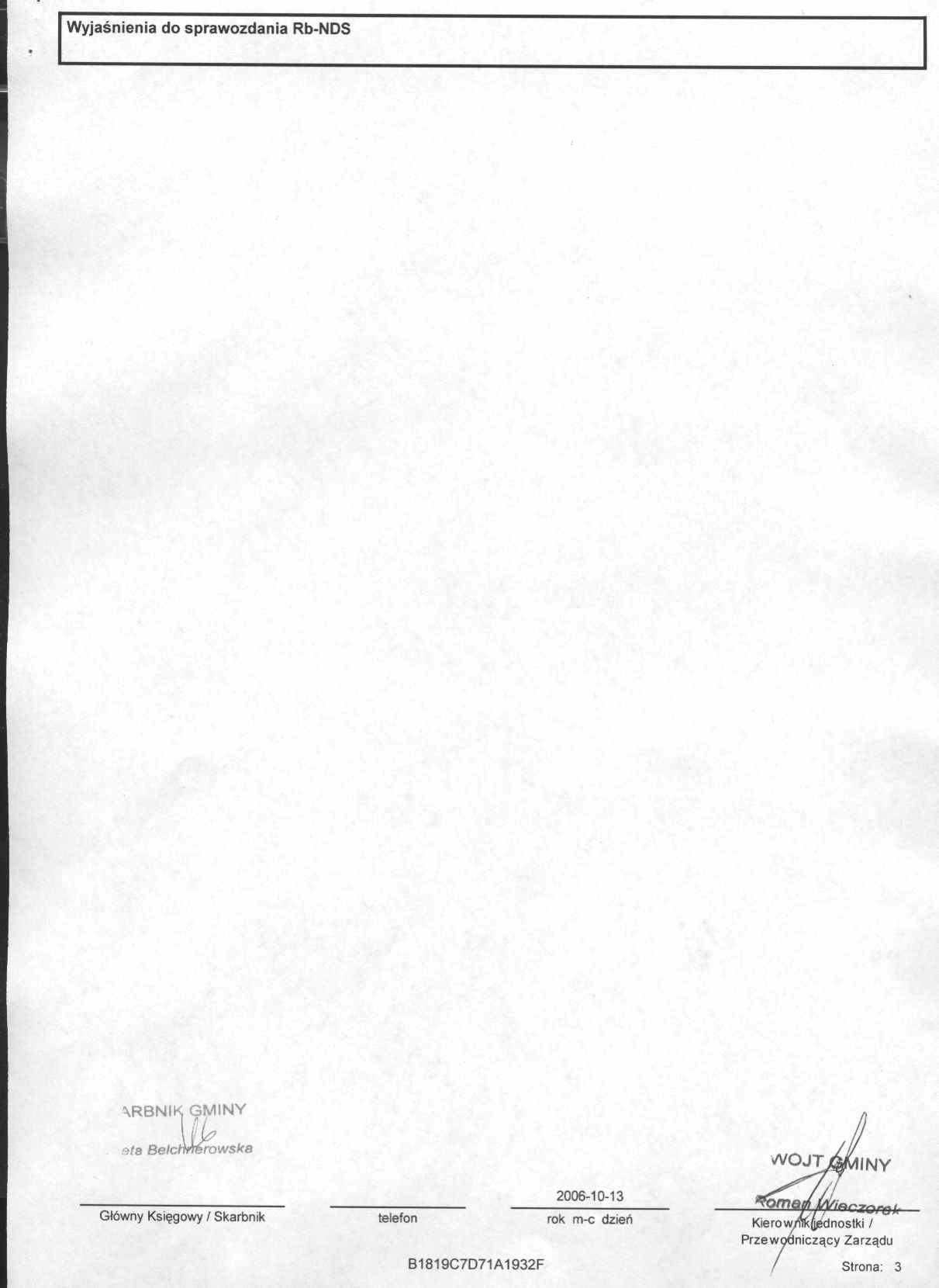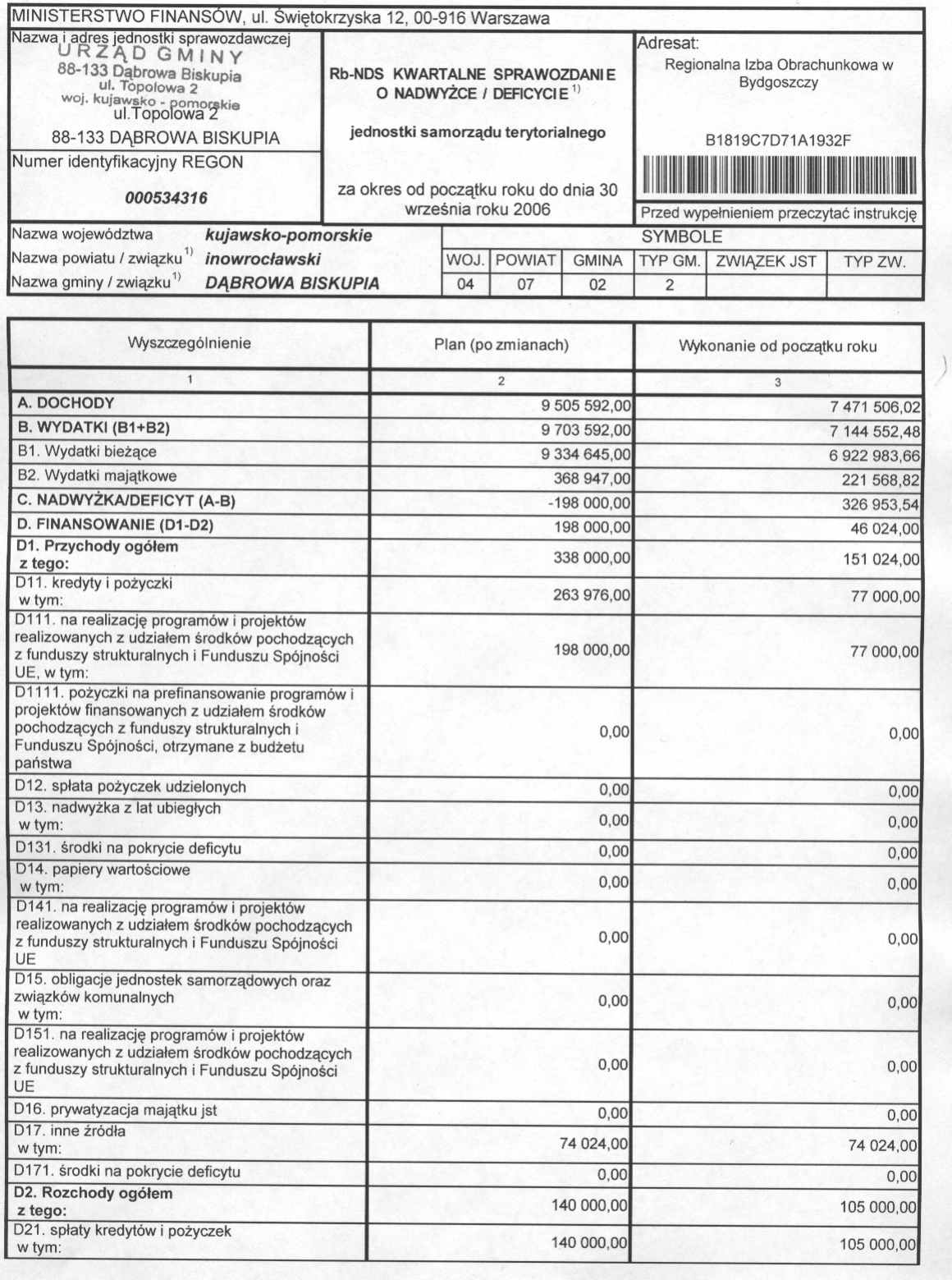 Rb-NDS – sprawozdanie z wykonania budżetu gminy za trzy kwartały 2006 r.