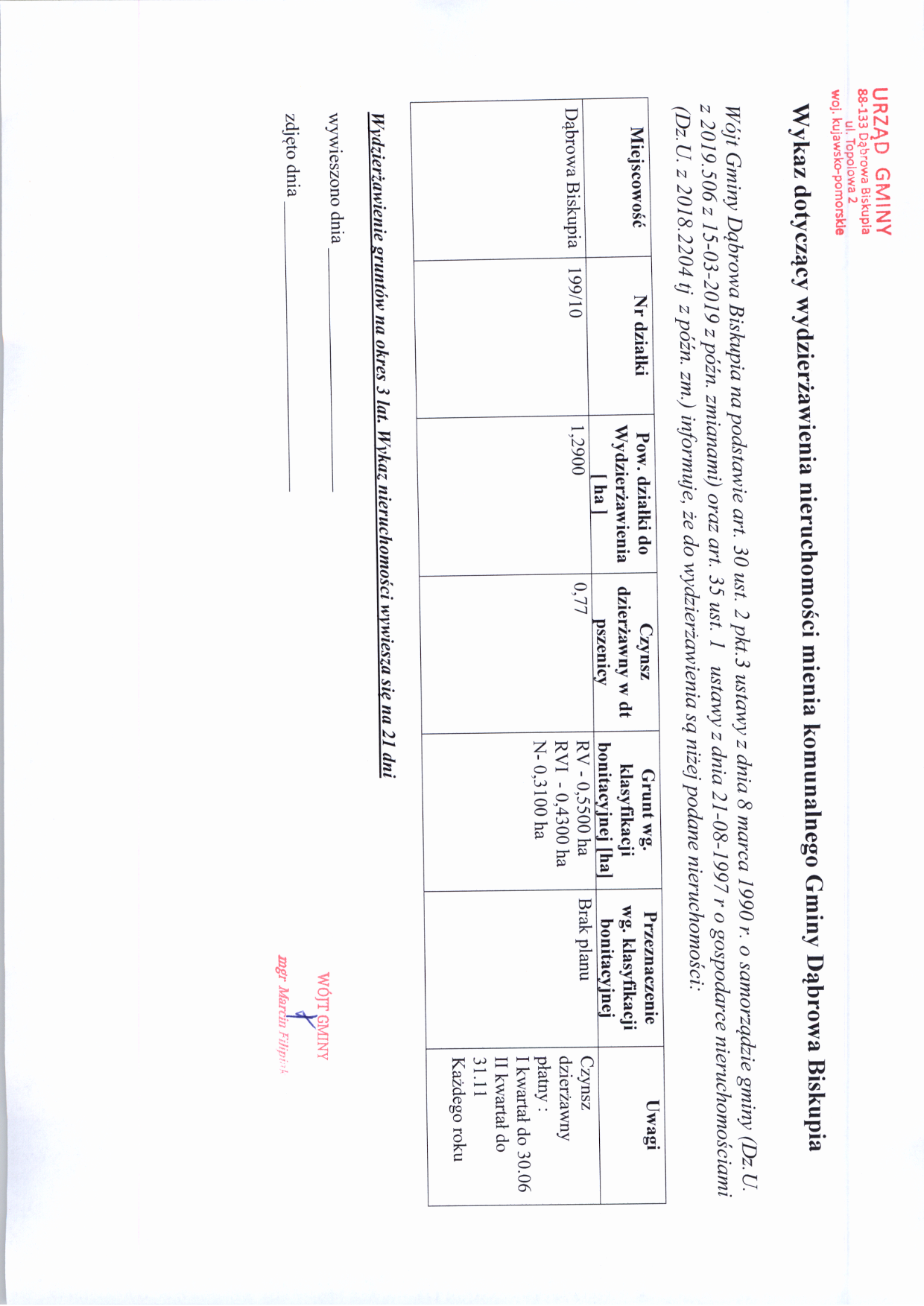 | wytworzono: | data: - 14.08.2019 | przez: Wójt Gminy Marcin Filipak | |
