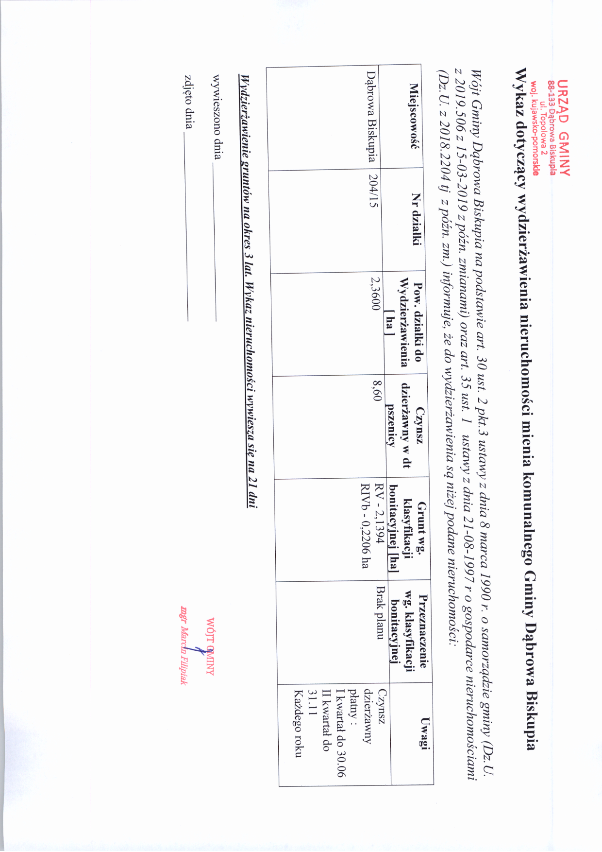 Wykaz dotyczący wydzierżawienia nieruchomości mienia komunalnego Gminy Dąbrowa Biskupia – Dąbrowa Biskupia dz. nr 204/15